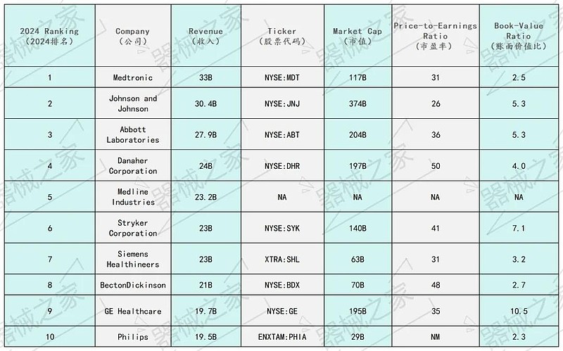 此外,史赛克(230亿美元)、西门子医疗(230亿美元)、BD医疗(210亿美元)、GE医疗(197亿美元)、飞利浦(195亿美元)也进入榜单前10。