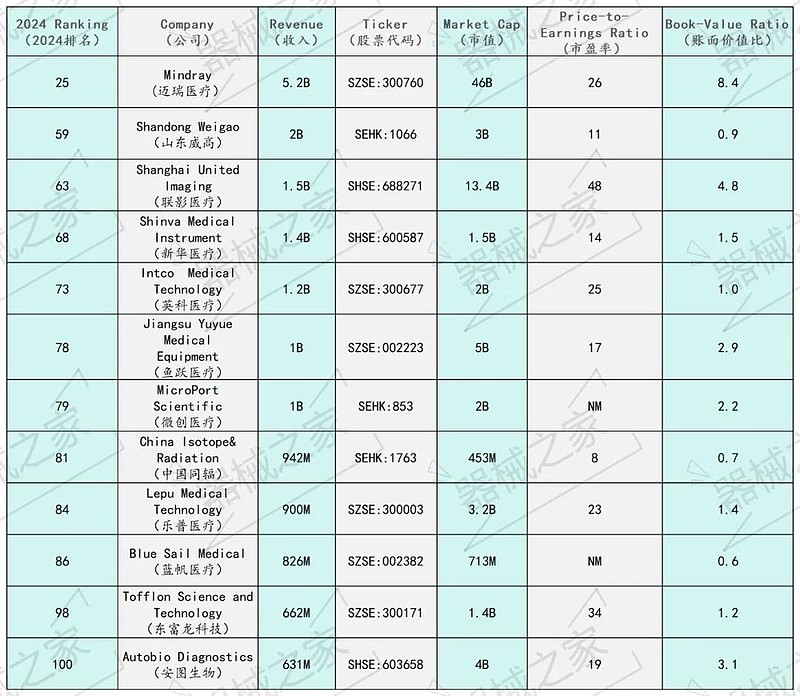 值得一提的是,迈瑞医疗、威高集团、联影、新华医疗等12家企业也进入了该榜单。其中,迈瑞位居第25名,与其“最晚在2025年成功实现全球医疗器械TOP20的目标”又更近了一步。
