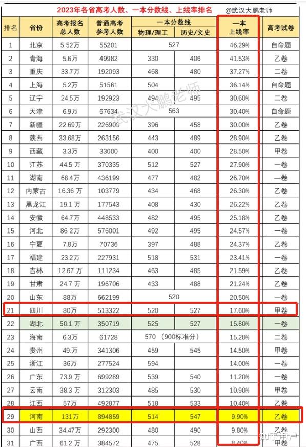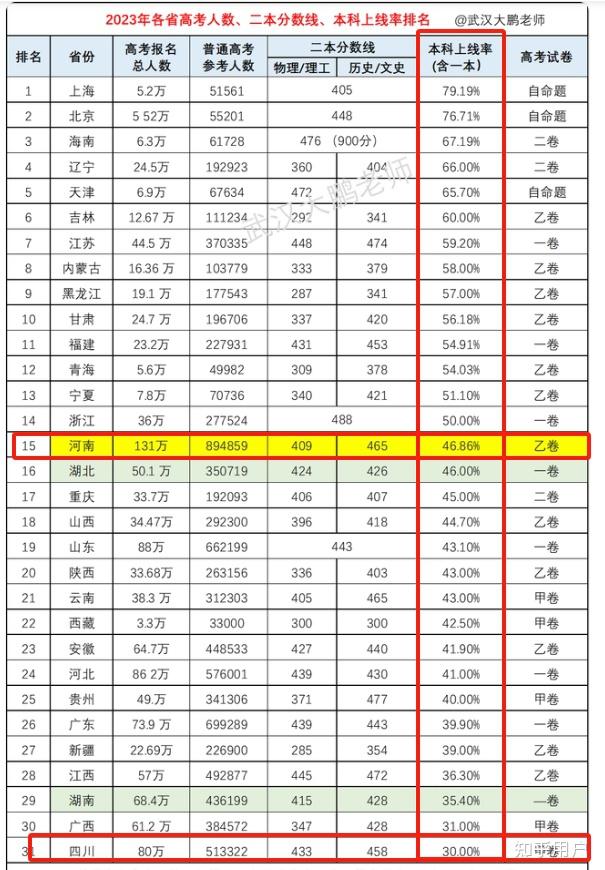 二、高考的录取难度二省难兄难弟,互有高下根据目前查询到的资料,河南的本科上线率为46.86%,大幅高于四川的30%(全国倒数第一);而一本录取率则是四川的17.6%远高于河南的9.9%。(增补:虽然四川的一本率注水过,很多省外二本在省内是一本招生,但是四川的985和211大学数量质量都远超河南,因此本省的985、211录取率实际上是超过河南的,跟一本率的趋势类似)。在保下限方面,四川考生比河南面临更严峻的挑战,河南对于省内普通本科高校的普及建设效果显著;不过在考取名校方面四川有显著的优势,这可能与四川有较多211和985高校有关。