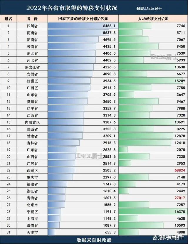一、四川人均支付转移高于河南,作为西部地区吃了政策红利(但是远不如刻板印象的多)根据2022年的数据,四川人均支付转移为7746,显著高于河南省的5711元。但是根据四川省内的数据,而根据四川省府的资料,仅占据四川人口只有8%左右的三州地区(甘孜阿坝凉山)即瓜分了四川一千多亿,占比20%以上的财政转移金额。因此,校正后的四川汉地18市的实际人均支付转移在6700元左右,依然略高于河南的5711元水平。