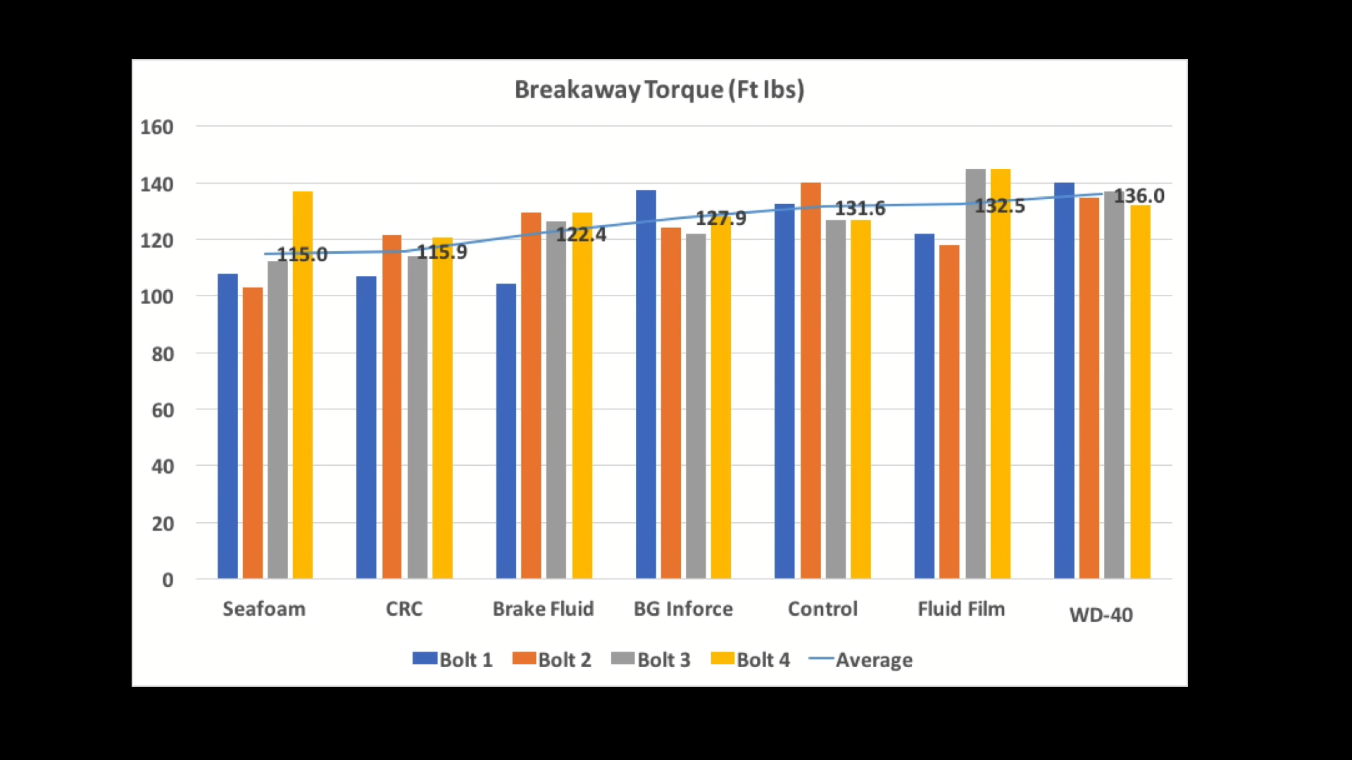 加入各种渗透油后松动螺栓所需的扭矩(Project Farm)