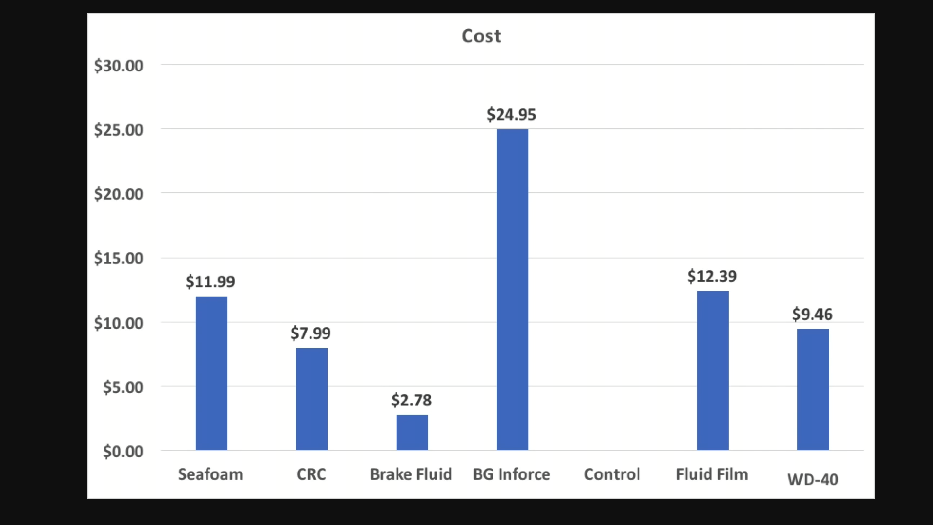 参加测评的渗透油成本(Project Farm)参考^Martin2009 https://web.archive.org/web/20190218043350/https://www.nytimes.com/2009/07/22/business/22barry1.html^WD-40 SDS https://files.wd40.com/pdf/sds/mup/wd-40-multi-use-product-aerosol-low-voc-sds-us-ghs.pdf^Homemade https://www.engineeringforchange.org/news/how-to-make-penetrating-oil/^Penetrating Oil Ep2 https://www.youtube.com/watch?v=st8dkGzJWtg