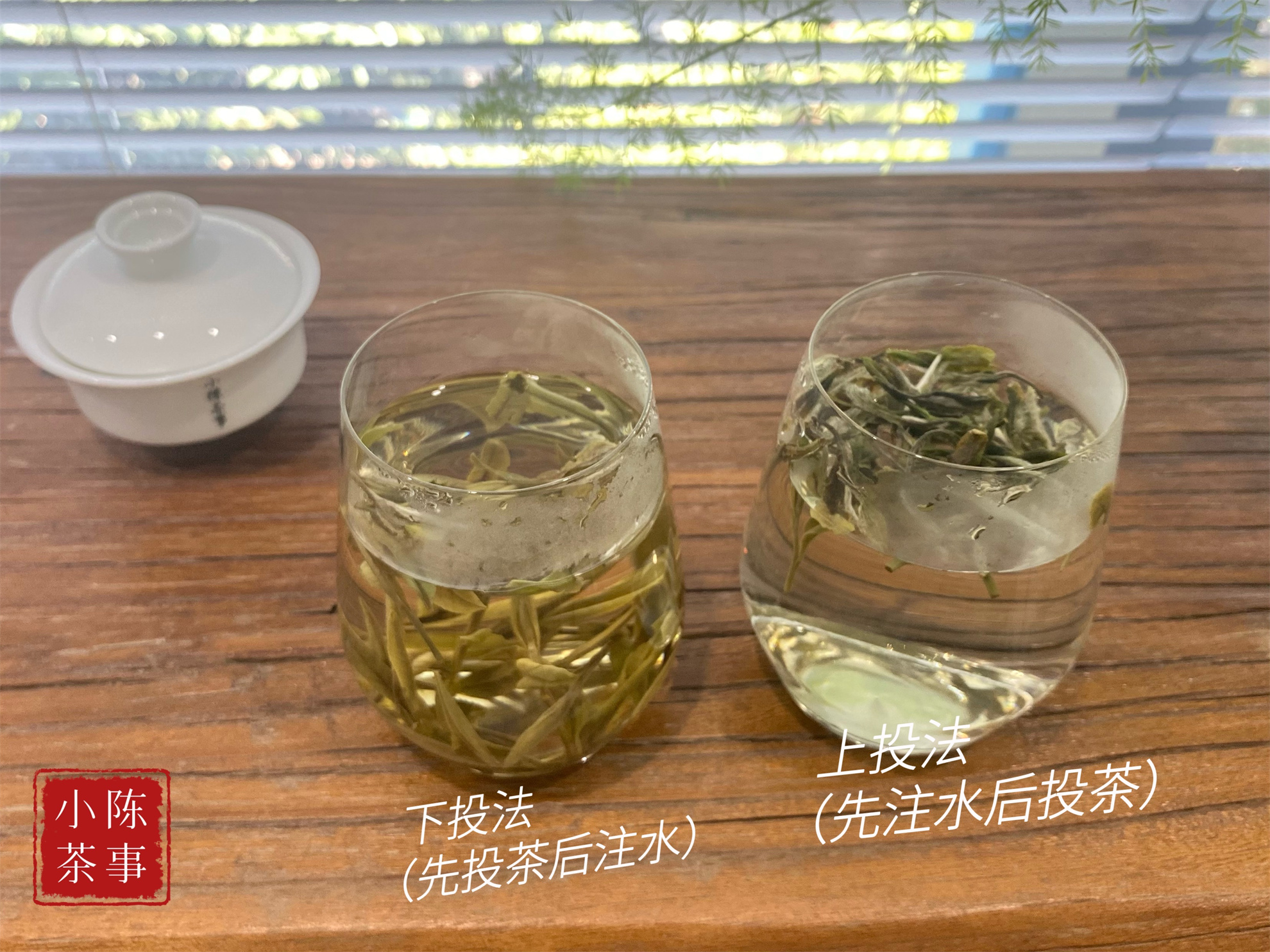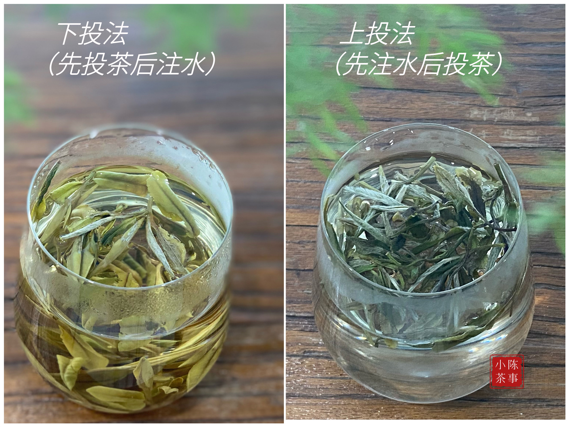 上投法,即开篇那位茶友的做法,先往杯里加水,再将适量干茶放在水面。