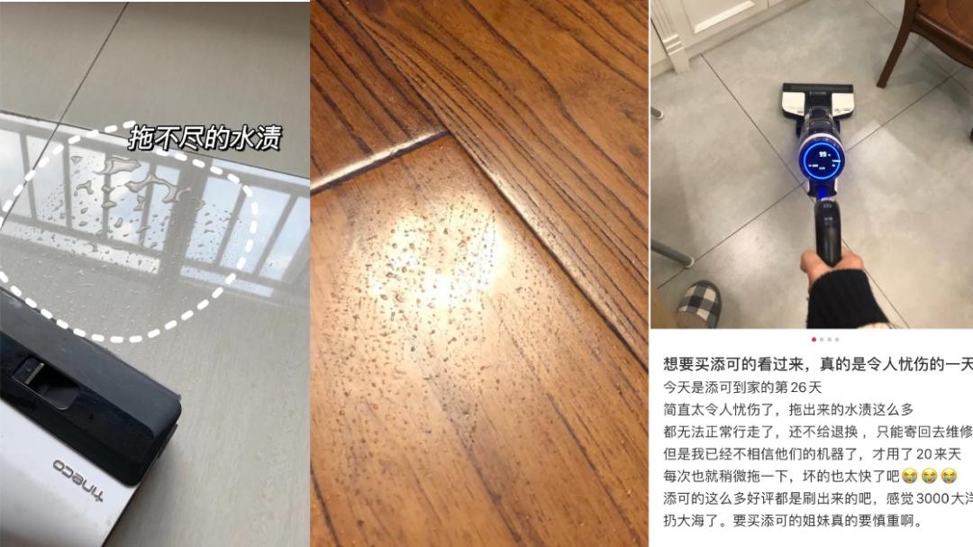 而添可重点宣传的“清洁不留死角“,也受到了质疑。“靠墙擦地永远都有一条黑印子。”有消费者在“黑猫投诉”上表示。微博、小红书和知乎等平台也出现了相关吐槽,“床底和沙发底还是拖不到,替代不了传统拖布”、“墙边是擦不到的,往台子下面伸也会有角度限制”……