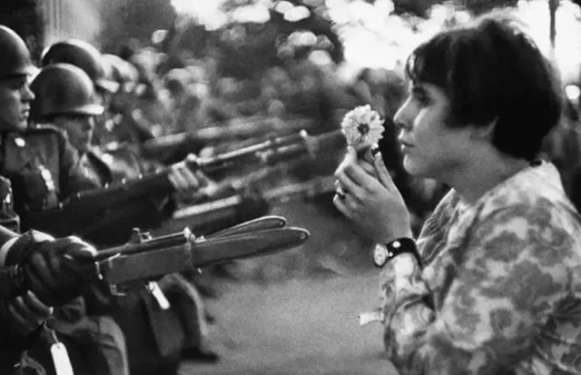 1967年10月21日,华盛顿五角大楼门发大规模反越战,面对荷枪实弹的军警,一位名叫简罗斯(Jan Rose Kasmir)的17岁女孩,她手持鲜花站在军警面前的瞬间,被一位名叫马克吕布(Marc Riboud)的法国摄影师定格下来,成为了著名的反战摄影作品。