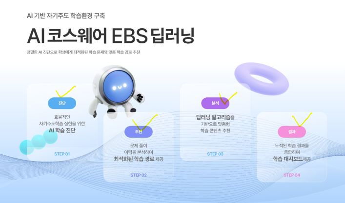 EBS 홈페이지 회원가입 https://www.ebsi.co.kr/ 로그인 후 무료 서비스 이용 가능 AI 코스웨어: 정밀한 AI 진단으로 학생에게 최적화된 학습 문제와 맞춤 학습 경로를 추천합니다. 진단평가부터 개념,심화,최종 학습으로 단계별 학습코스를 진행합니다. AI 문제은행 : 문제추천, 시험지 만들기 를 통해 개인이 필요한 맞춤 과목과 문제조건을 제시하면 문제가 추출됩니다.