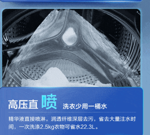 (2)“净”: 这得益于它的“精华洗”技术,它是通过预混高浓度洗衣液溶液,再通过高压直接喷淋浸润衣服,因而其洗净比全部高达1.1,远超行业标准1.03,所以能洗得干净。