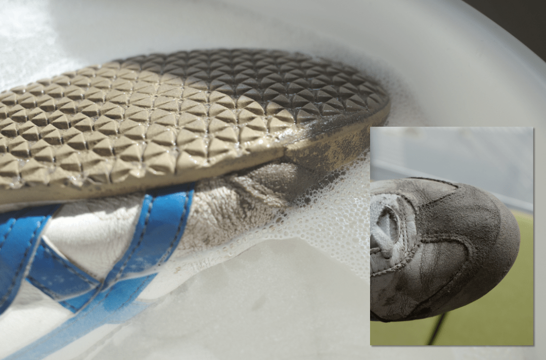 前后对比效果非常明显,泡完的鞋子只要再晒干就行。