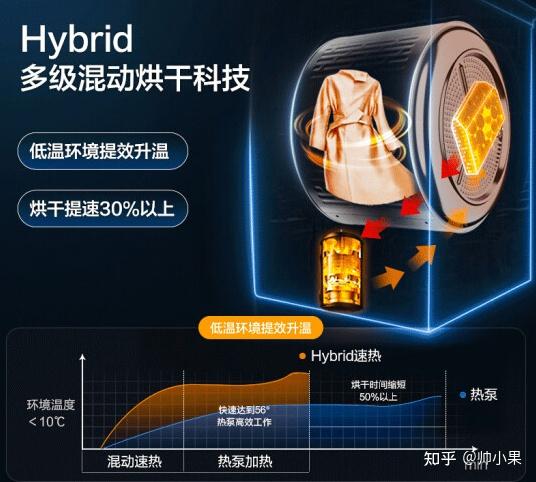 (4)Hybrid混动速热Hybrid混动速热属于电辅加热功能,主要用来解决冬季低温时烘干机内筒升温慢、效率降低的难题,可以在10分钟左右将筒内温度快速提升到适合热泵工作的56℃,比普通热泵型号省时30%以上,烘干效率更高,同样可以减少烘干等待时间。