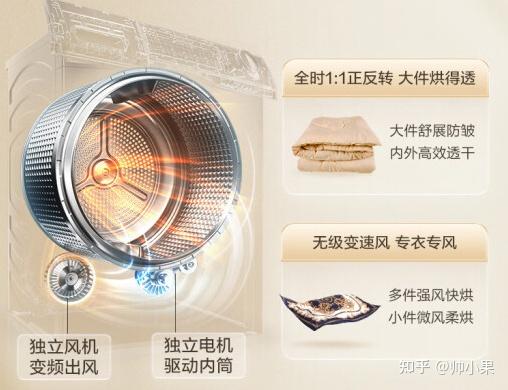 而传统热泵烘干机只有一个电机,既要负责带动内筒,又要负责送风,一只手当成两只用,分身乏术,所以只有正转时送风,不转、反转时无风,烘干效率相对更低;而且风速固定,对于小件或者娇贵面料的衣物纤维不太友好;海尔这类烘干机一般是8:1正反转。