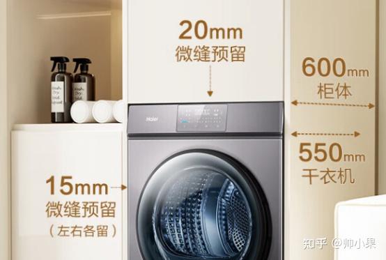 三、烘干机安装注意事项国标烘干机和滚筒洗衣机一样,宽595mm、高850mm都是固定的,主要是机器深度有差异,如果打算嵌入式安装,烘干机后方需要预留30mm以上的空间;如果对嵌入要求相对更高的,尽量选机器深度在600mm以下的型号。