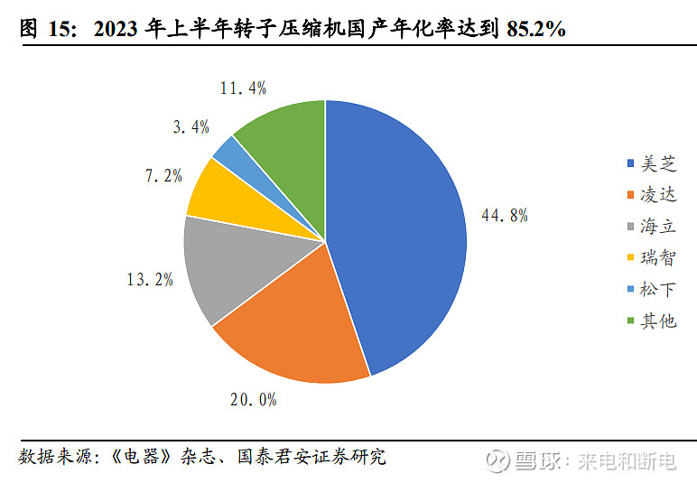 替代成果最大的就是转子压缩机,中国已经占了国内和全球最大的份额。我国转子压缩机 2022 年总产量达 23007 万台,约占全球总产量的90%。
