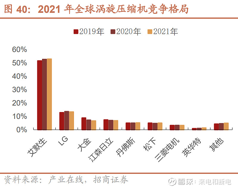 在全球市场上,发明了涡旋压缩机的艾默生(谷轮)一家独大,全球市占率 53%,LG 13.4%,大金6.7%、日立6.9%、丹佛斯5.3%,松下5.1%,三菱电机3.3%,中国最大的英华特市占率仅 1.4%,排名第八。