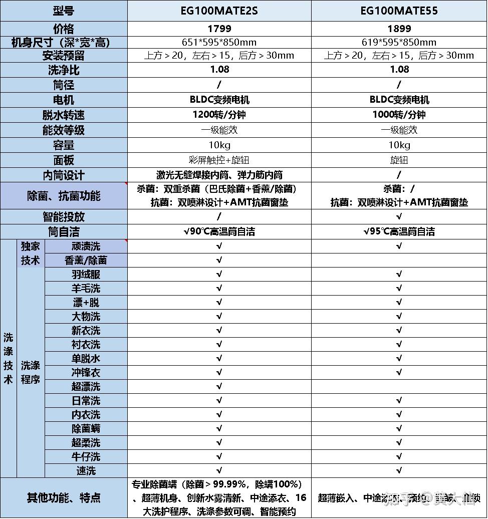 小结:这两款都属于海尔最便宜的入门级滚筒洗衣机,洗涤效果还行,比波轮明显更强,在乎杀菌功能的选EG100MATE2S,在乎智能化程度更高、使用更便捷的选EG100MATE55。