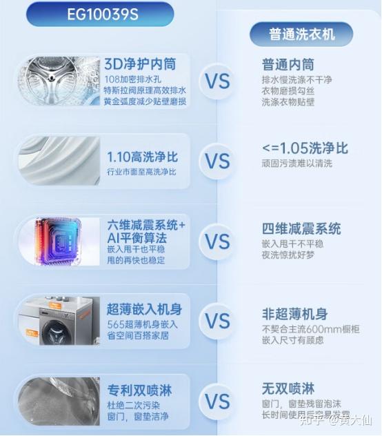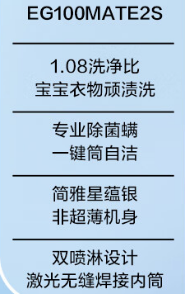 其他方面这款和EG10039S一样,洗净比都为1.1,都采用BLDC变频电机,脱水速度达1200转/分钟,也同样采用宝藏内筒设计(支持3D净护内筒+水幕拨叶+急速脱水),也支持巴氏除菌+双喷淋设计+AMT抗菌窗垫抗菌,可实现95℃高温筒自洁。