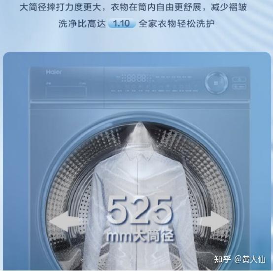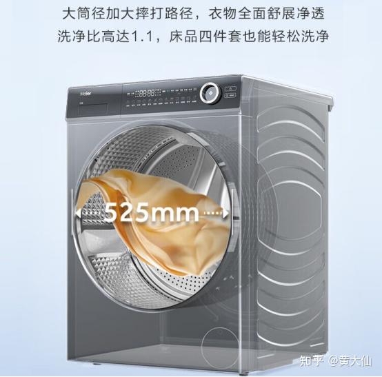另外,对于滚筒洗衣机,大筒径设计更有助于增强衣物在洗涤过程中的摔打、挤压和摩擦作用力,更深入地去除污渍,比如海尔的大筒径滚筒洗衣机可达525mm。