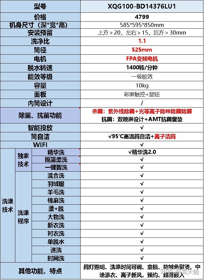 其中洗衣机的洗净比为1.1,搭载了高端FPA变频电机,脱水转速更是达1400转/分钟,洗涤效果非常好。