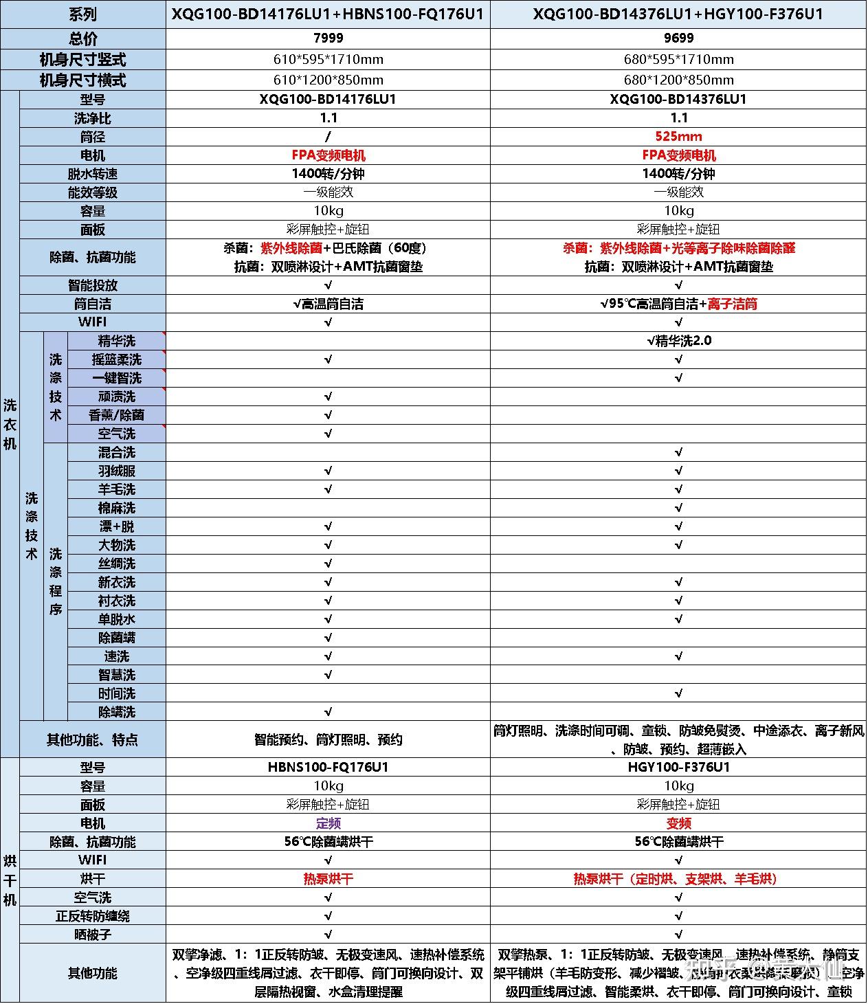 小结:配置最好、功能最强、洗烘体验过程最舒适、洗烘效果最好的选XQG100-BD14376LU1+HGY100-F376U1,想买性价比较高、价格稍微便宜点的洗烘套装选纤美XQG100-BD14176LU1+HBNS100-FQ176U1。