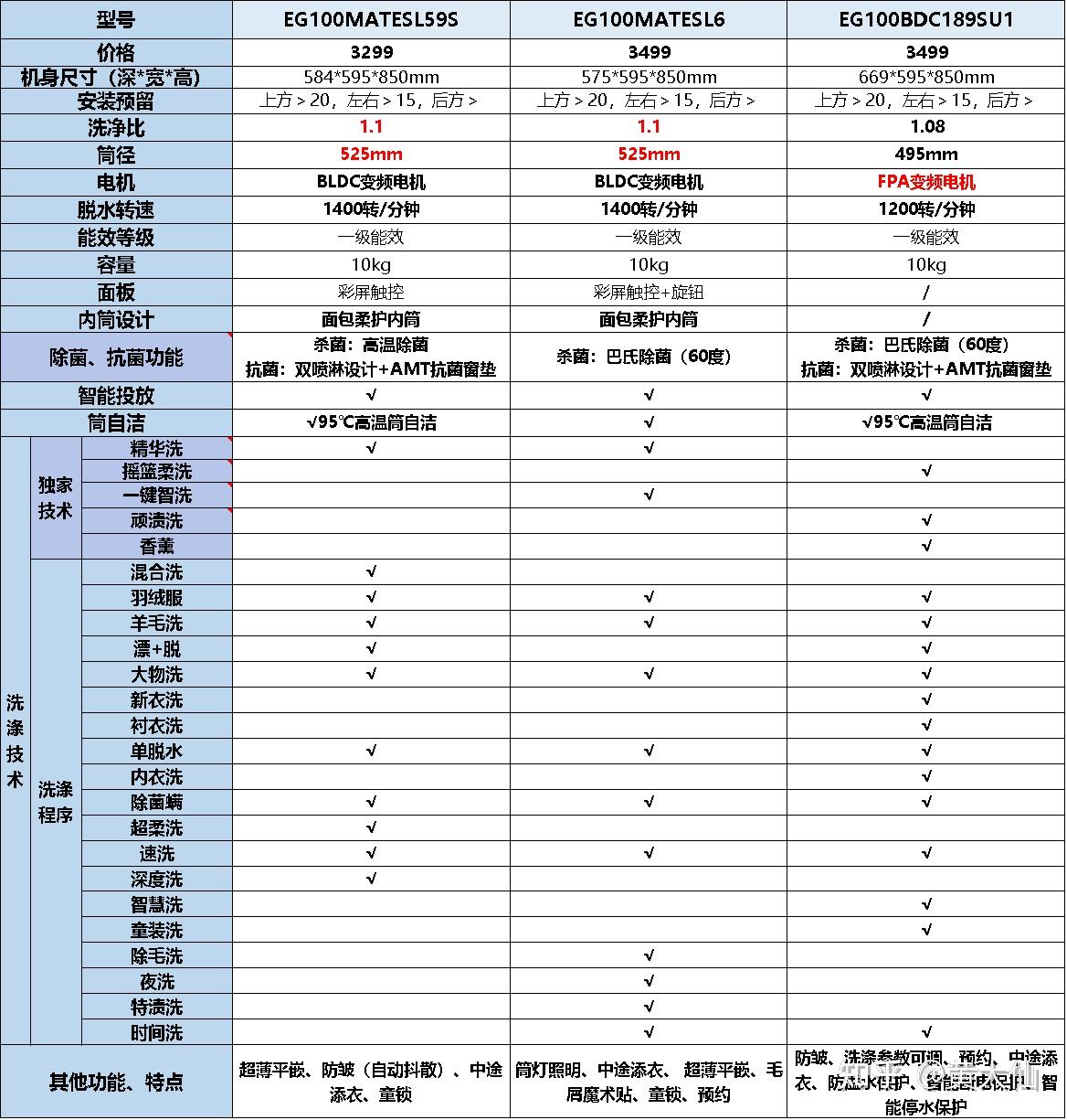 小结:清洁能力强的选EG100MATESL59S ,智能化程度高+清洁能力强的选EG100MATESL6,对清洁能力要求不是特别高+洗涤程序更丰富的选EG100BDC189SU1。