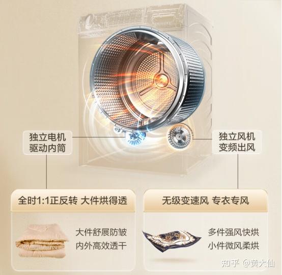 另外烘干机还采用筒门可换向设计,搭载双擎净滤、速热补偿系统、双层隔热视窗,支持无极变速风、空净级四重线屑过滤、衣干即停、水盒清理提醒等功能,功能效果和功能都远超洗烘一体机。