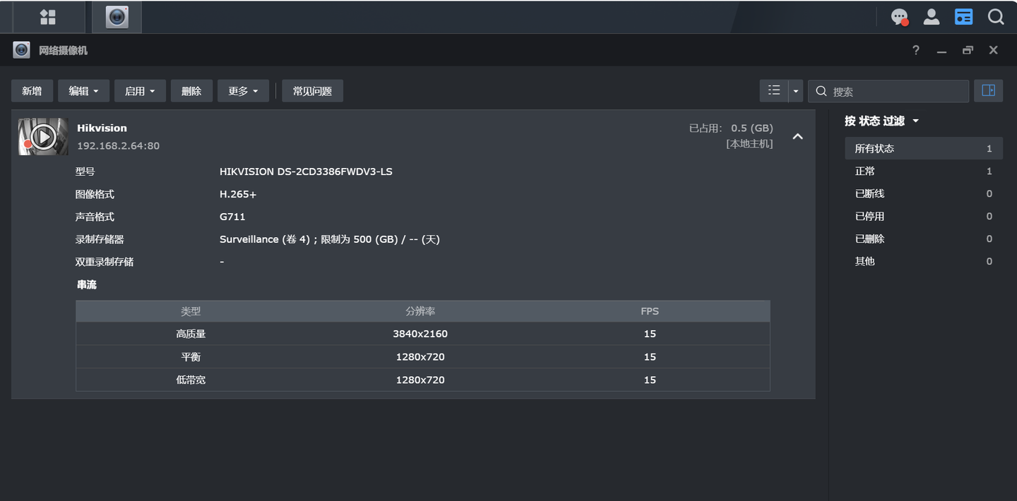 如果我将限制存档文件大小控制在500GB,那么大约可以存储45天的视频,够了。