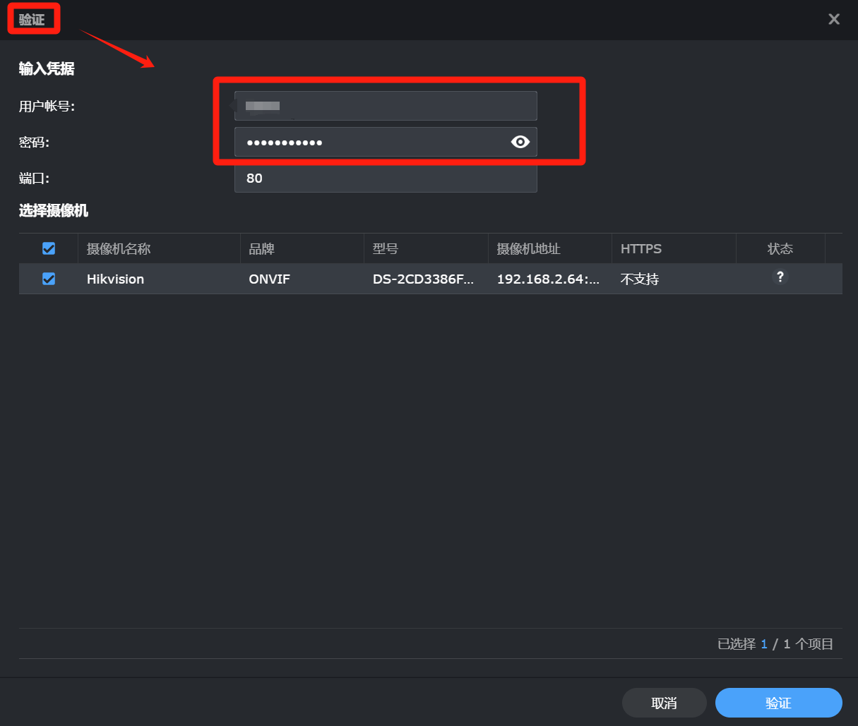 验证摄像机的【用户账号】和【密码】