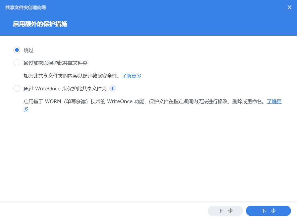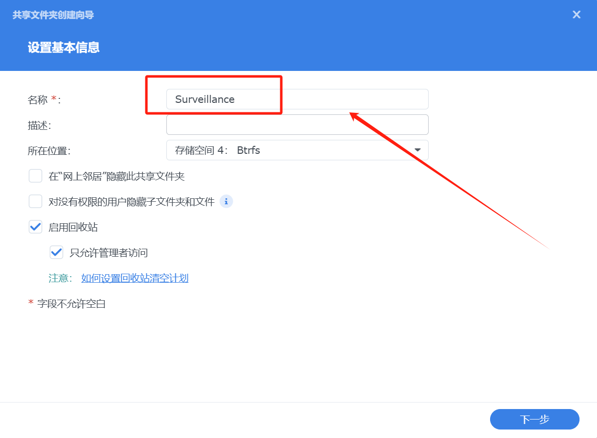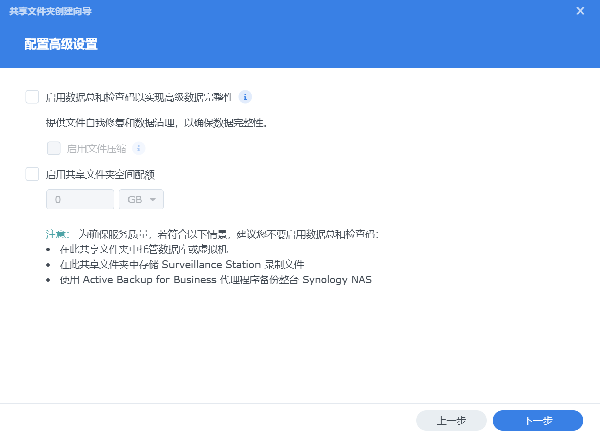 我们在这里暂时不用【启用共享文件夹空间配额】,后面我们通过Surveillance Station来进行设置存储空间的限制和循环。