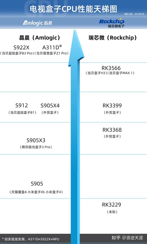 电视盒子好不好,先看性能,在看体验;而性能就是芯片处理器,也就是CPU;电视盒子CPU日异月殊,最早制造智能电视盒芯片的厂商比较集中在晶晨Amlogic、全志、瑞芯微、MStar、炬力、海思等,而现如今,只有晶晨芯片性能和配置最为良好,今天就来带大家看看2023电视盒子CPU天梯图,看看2023电视盒子CPU排行榜谁才是王者。