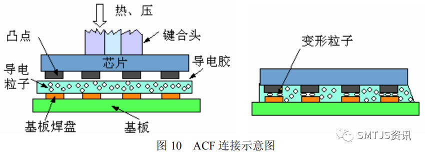 ACF 材料是将细微的金属粒子或外表镀有金属的塑料小球分散在树脂材料中,以B 阶状态下的薄膜形式存 在。当把 ACF 贴合于 IC 的凸块与基板线路之间后,利用适当的压力,温度和时间使树脂开始流动而导电粒子 则与凸块和基板线路接触而达到电气导通的作用。在此同时,又由于选用适当的导电粒子粒径及添加量,使其 在凸块与凸块之间彼此无法接触从而达到各向异性导通特性。ACF 的原理图见图 9。