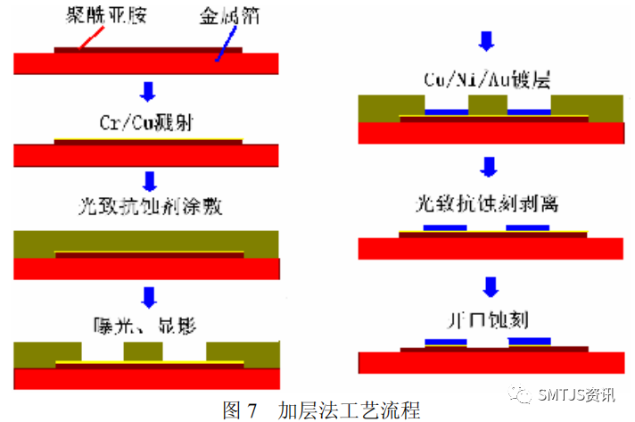 加层法是利用绝缘基材直接加工形成电路图形的方法。图 8 为加层法的典型工艺流程。