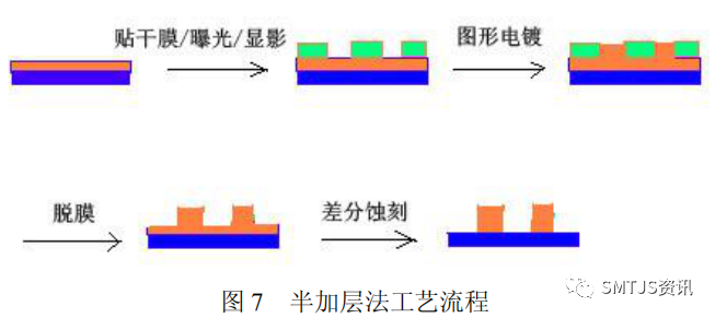 如果要制作更加精细的线路,可考虑采用半加层法。此种方法的工艺流程见图 7。