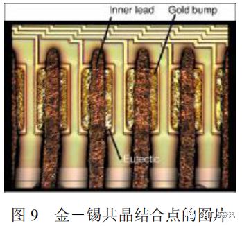 这种工艺是利用IC芯片上的金凸块和镀上锡的FPC内部引线,通过加热加压,在接触面形成金-锡共晶, 达到连接的目的。这种方法的焊接温度必须在金-锡共晶的形成温度(325-330℃)以上,这对基材的耐热性 是个严峻的考验。另外,合适的焊接温度不好掌握。当连接部分温度比较低时,内部引线共晶形成不充分,导 致内部引线开路。然而,当连接部分温度太高时,焊接工具在金-锡共晶还处于熔化状态下就上升离开,这也 容易导致内部引线开路的发生。还有,当温度较低并且内部引线上镀锡较厚时,锡不会被金所吸收(没有共晶 生成),这会导致短路和漏电。选择一个合适的温度十分重要,现在采用较多的400℃这个温度。图9为共晶焊接 示意图。