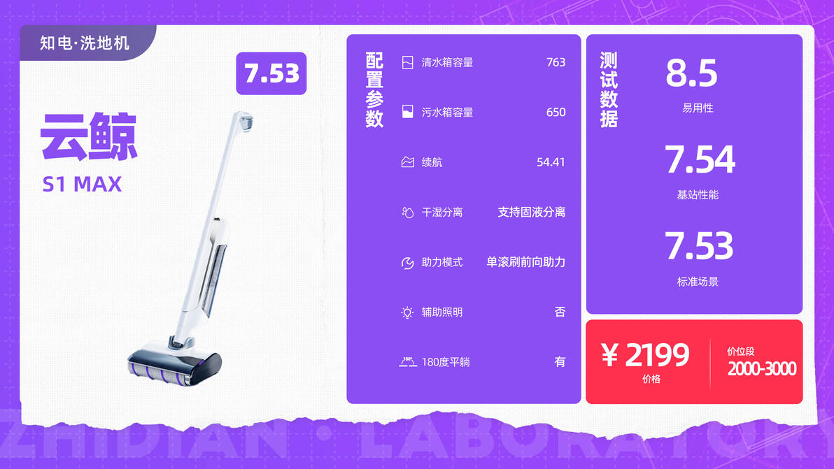 云鲸洗地机S1 Max(白色) 吸拖一体180°躺平全自动家用扫地拖地机吸尘器 无线智能手持电动拖把 ¥999起 云鲸S1 Max,这也是一款非常不错的洗地机,7.53分的综合评分,也是我们TOP10的产品,目前排名第6。