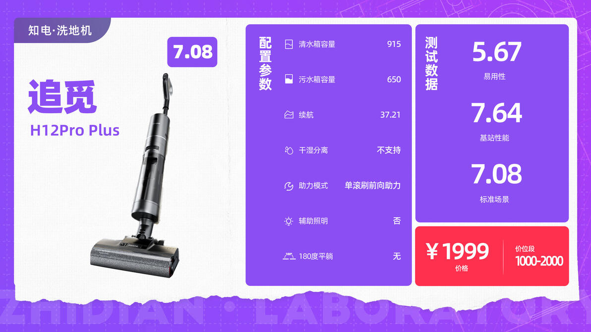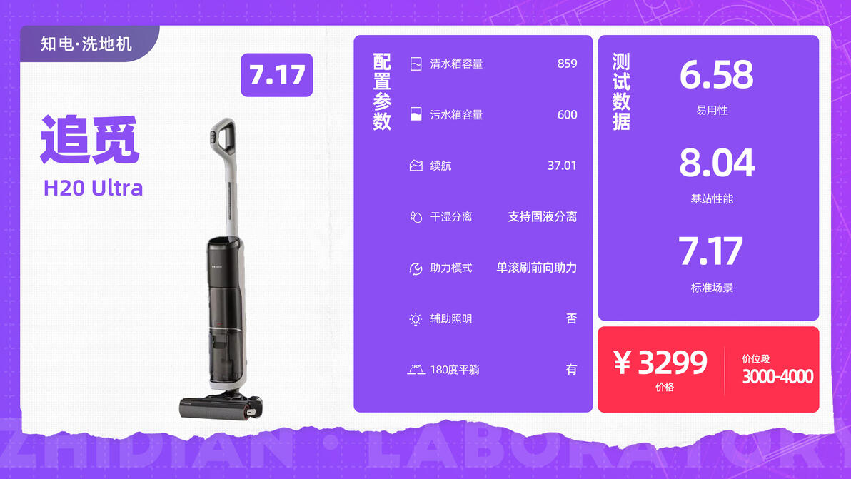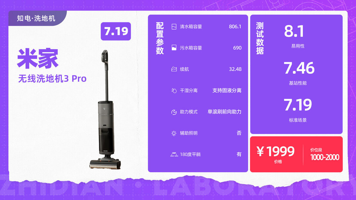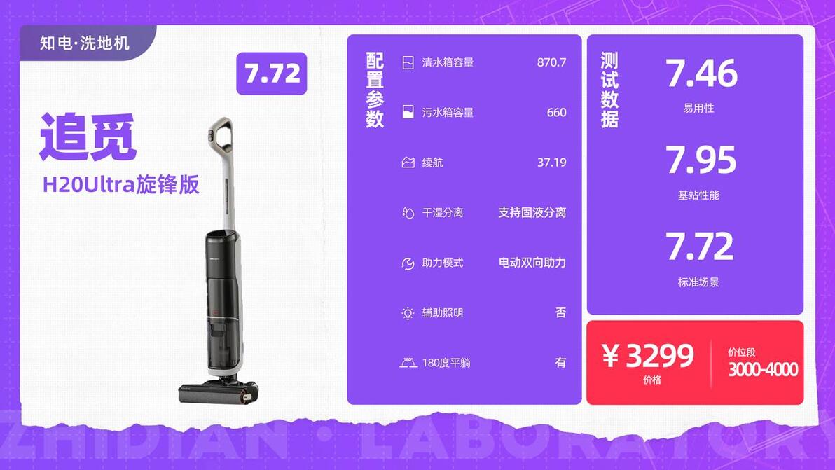 米家无线洗地机3 Pro售价1899,测试评分7.19分,排名第9,这台洗地机升级了60°C热水自清洁,支持全链路电解水除菌,升级了毛发防缠绕系统,产品由顺造代工,在这台产品上,我们测试到比较高的自清洁温度,3 Pro有一个比较大加热条来实现滚刷的升温,不过耗电量不小,单次耗电0.2度,测试中发现,这款产品防缠绕、固液分离做的都不错,不过洗地机清洁完,如果提着返回底座,会有遗撒现象,这个在今年的云鲸S2上已经彻底解决了,追觅H20 Ultra 旋锋版也是有着不错表现的,自清洁方面,底座也容易残留污渍,我感觉差不多的价格,还不如选择云鲸S1 Max。