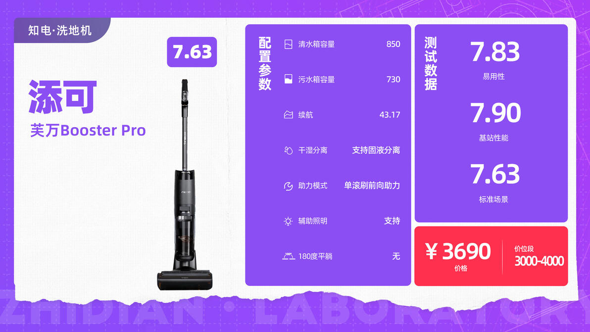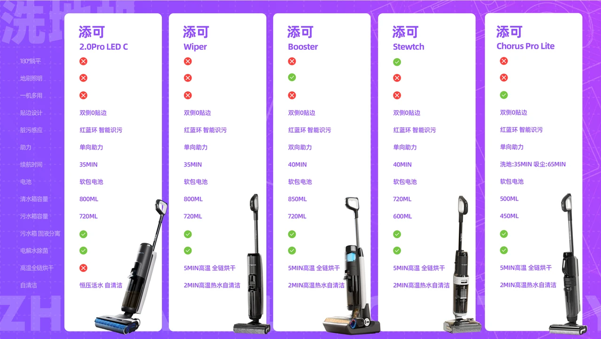 添可的产品线也比较长,简单来说,从经典的2.0 Pro LED升级了软包电池后的2.0 Pro LEDC这个型号出发,Wiper改进了高温热水洗涤、高温除菌和速干,Wiper Pro有了滚刷升降洗,Booster则增加了双助力、改进了续航,Booste Pro涵盖了Wiper Pro和Booster的升级,增加了LED灯和滚刷升降洗,双助力和续航提升。