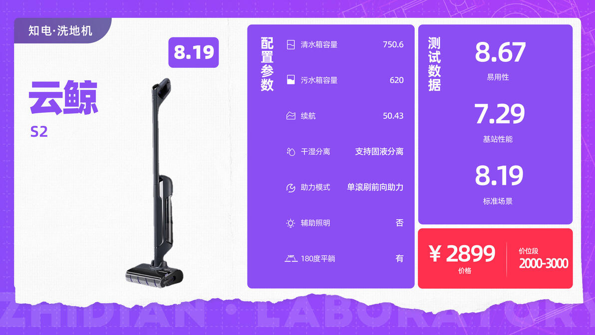 【全国补贴15%】云鲸全智能洗地机S2智能检测三贴边高温熨干 ¥5099起 云鲸的2024新品S2,这次的综合评分榜首,我们测试完的评分是8.19分,评级为G标杆,代表知电目前评测到性能最好的产品 ,延续了前代产品S1 Max的外观和配色,从外表来看的话,底座部分做了较大的改变,采用了65°C高温熨干的干燥方式,这样一方面大幅降低了传统热风烘干噪声,以及烘干带来的细菌扩散,同时也让基站的外观更加的小巧富有科技感。