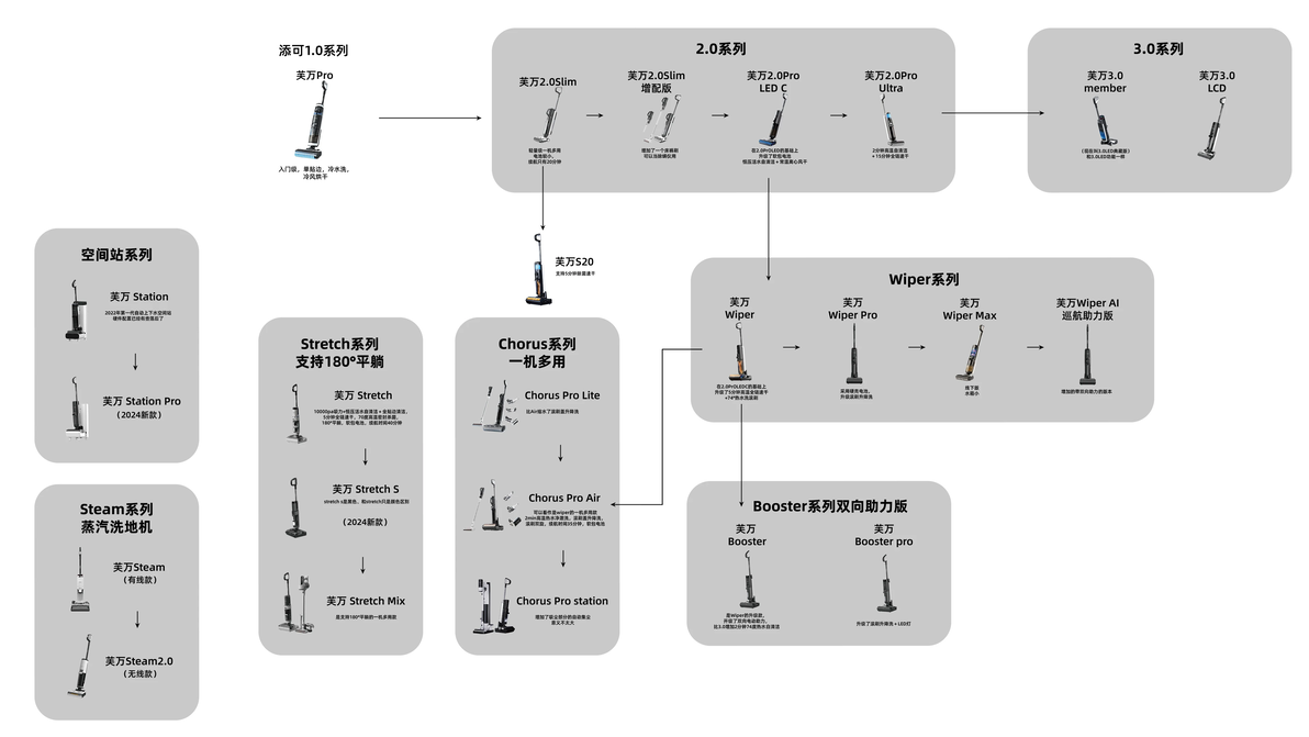 2023年年底推出的Stretch则在Wiper的基础上,实现了180°躺平清洁。也基本上是排列组合的型号思路。