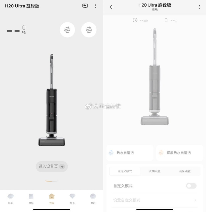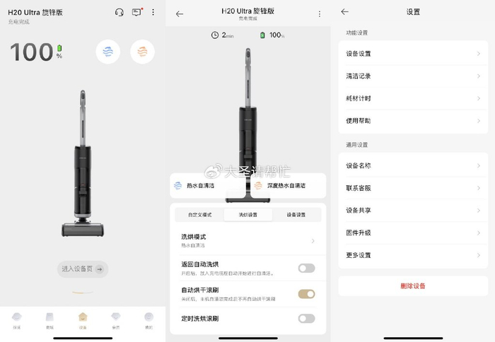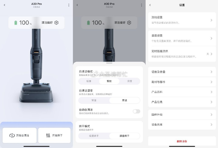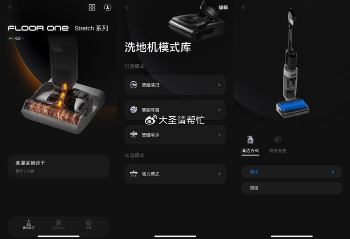 对比下来,添可的app只能说是聊胜于无……只提供了最基本的清洁模式选择和少量参数的自定义设置,远程控制、定时清洁什么的完全没有,而且界面入口也不明显,UI逻辑混乱,改善空间巨大。