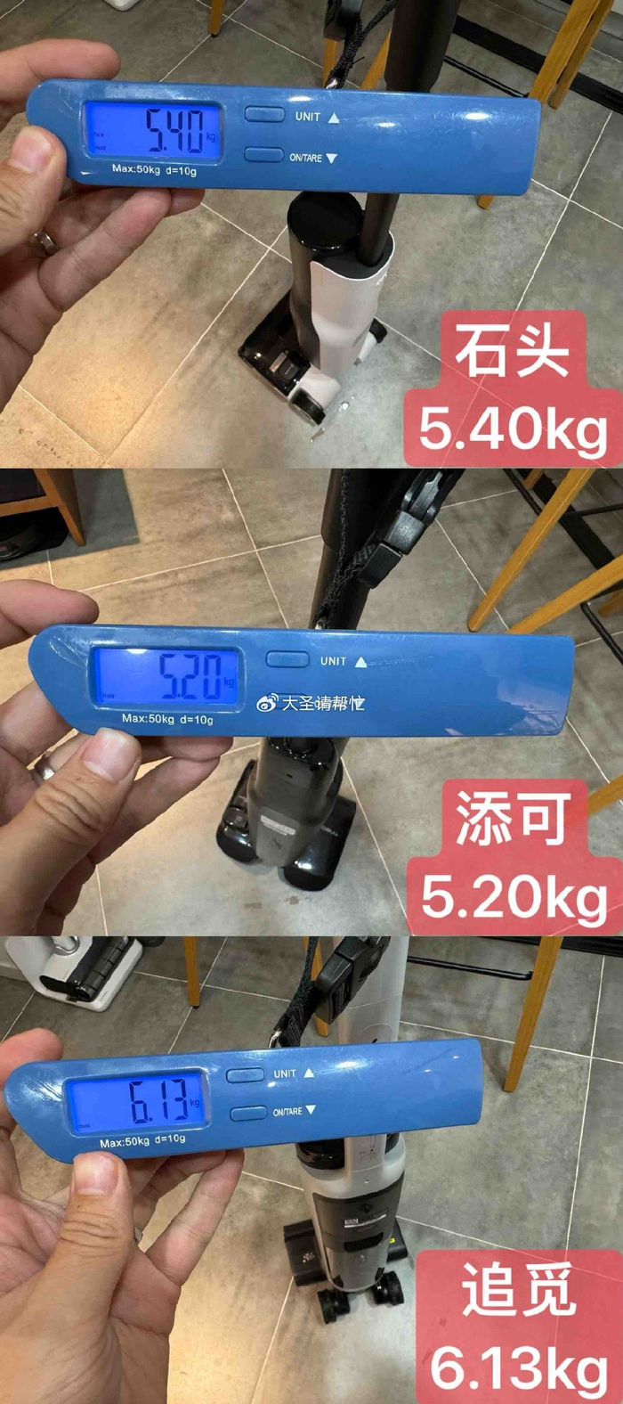机身重量是影响静态模式下移动是否费力的最主要因素,加满清水后,三款机器的实测重量:追觅>石头>添可