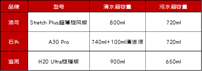 通过下表可见,追觅的清水箱容量最大,但是污水箱容量却最少,这就有点尴尬了。添可和石头的清水/污水续航相对则比较匹配。