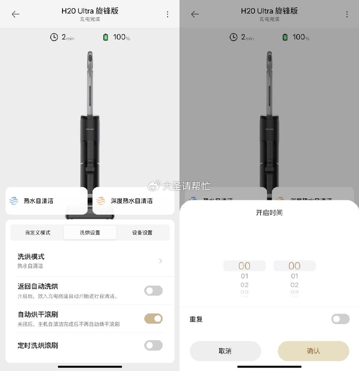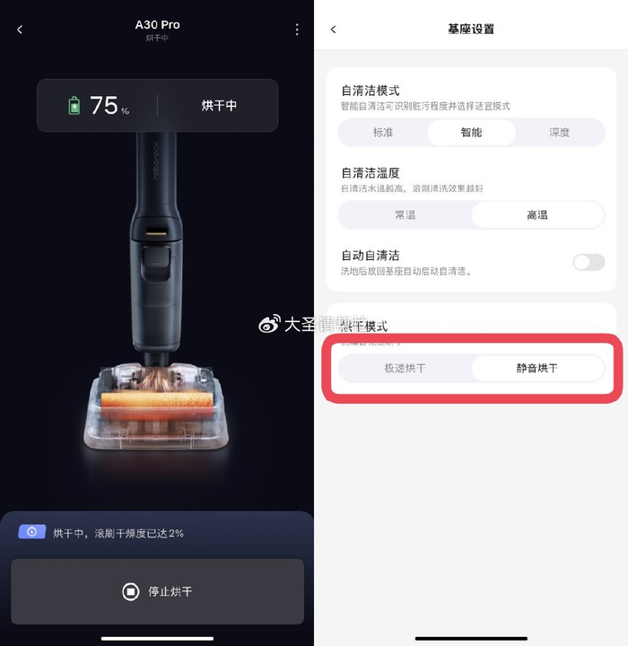 而追觅虽然没有静音烘模式,但可在app上设置定时清洁,将烘干时间调整到家里无人时段进行,也算一定程度上进行了弥补。