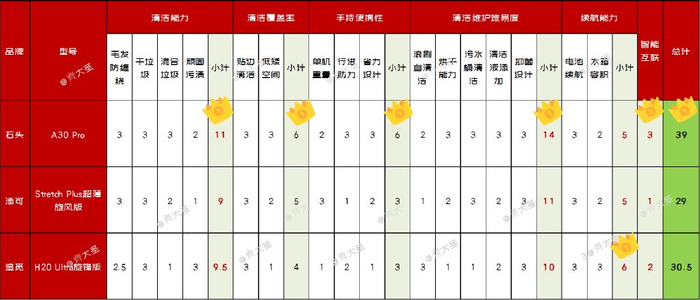 虽然测试和打分并不严谨,比如并没有涉及权重等考量,但是从上文的各项对比中可见,石头A30 Pro在各项测试的表现中表现均衡,没有明显短板,虽然价格是三款中最便宜的,但是实际表现去大大超出了预期,性价比非常高。但是为啥少给了半个星呢,从个人角度觉得,外观塑料感还是有点明显,且人机交互界面过于简洁,基本都是图标,不够直观,在这一方面添可做的就不错。