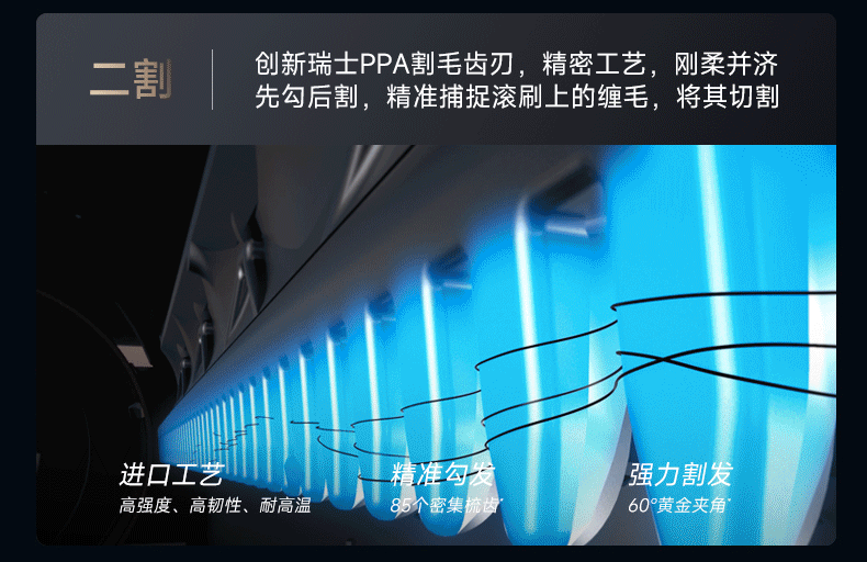 但是进行了创新,在梳齿后部增加了刀刃,先勾后割,精准捕捉滚刷上的缠毛,将其割断;