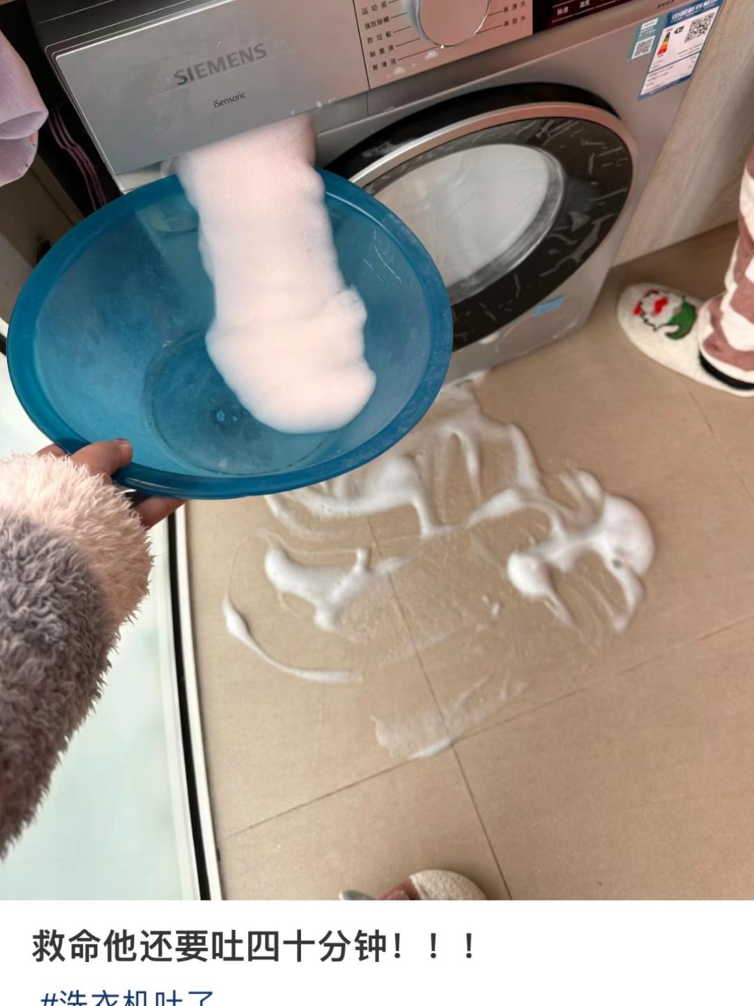 加了洗衣机清洁剂,洗衣机直接化身「自动吐泡泡机」;洗完之后,滚筒里面全是渣渣……