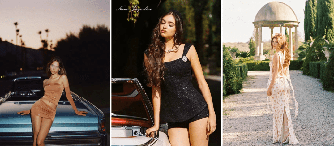Nana Jacqueline由两位华人设计师Nana和 Jacqueline,在美国洛杉矶联合创立。产品主要品类包括服装、饰品、鞋履。与其他“辣妹装”不同,Nana Jacqueline主打均价2000~3000元的轻奢轻礼服,同时融入辣妹装元素,这让品牌个性更加出挑,可炸街、能hold红毯等各种社交场合,因此受到越来越多国内外明星及时尚博主的青睐。