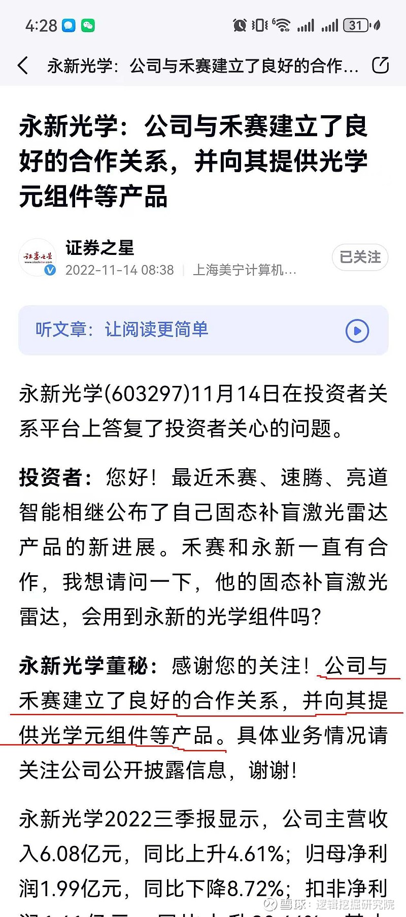 1.$永新光学(SH603297)$激光雷达上游企业,最早布局激光雷达光学元组件业务的光学公司之一,技术雄厚,财务状况良好,公司与禾赛、innovusion、北醒光子、麦格纳等激光雷达领域国内外知名企业建立深度合作,其中禾赛因其最近股价已翻倍而备受瞩目,根据公开信息显示,明确永新已直接向禾赛提供光学元组件。预计今年激光雷达业务销售收入有望达到1.5亿元。