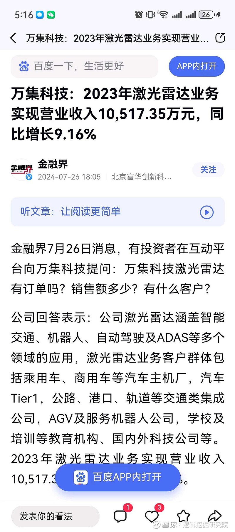 2.$万集科技(SZ300552)$激光雷达整机企业,涵盖智能交通、自动驾驶等多个领域的应用,客户群体包括乘用车、商用车等汽车主机厂,汽车Tier1,公路、港口、轨道等交通类集成公司,AGV及服务机器人公司等。2023年激光雷达业务营业收入10,517.35万元,目前公开数据中激光雷达收入最高的a股上市公司。