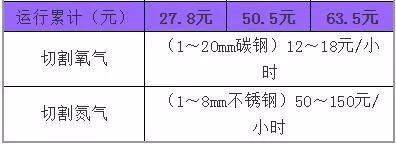 举例:切割1mm 的不锈钢累计50000 米的生产费用及约计时间周期(因薄板打孔时间及极短及空程且无法统计,且每个企业生产安排不同,由于属于横向效率及成本比较,所以对统计结果的比较影响不大,上下料时间不计算在内)