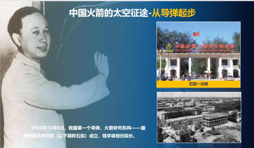 20 世纪 50 至 60 年代,我国开始发展现代导弹技术,成立了首个导弹与火箭研究机构——国防部第五研究院(简称“五院”),由著名科学家钱学森担任首任院长。如今的中国运载火箭技术研究院,正是当年五院的第一分院。