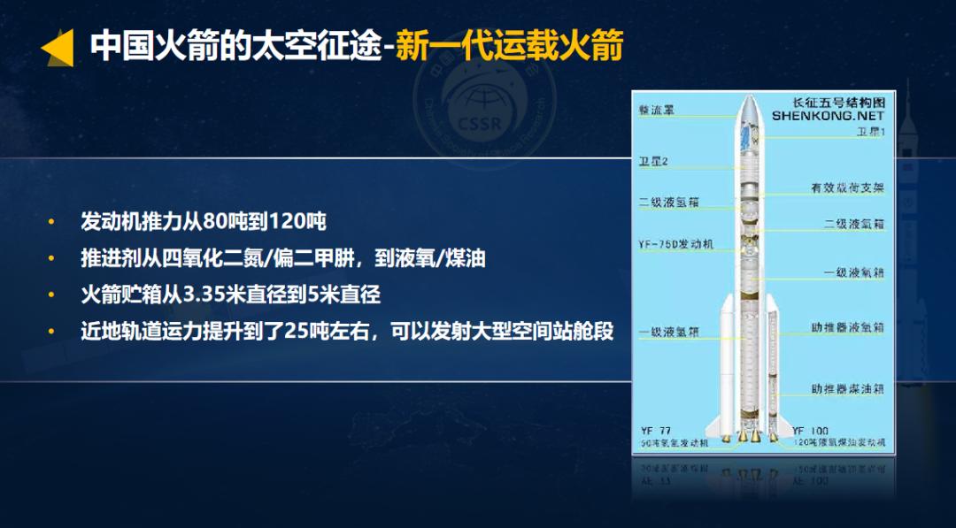 新一代运载火箭具备很多新的特点:首先,发动机最大推力从过去的 80 吨提升至 120 吨;其次,推进剂由早期的常规推进剂以及东风系列液体导弹所使用的有剧毒的四氧化二氮/偏二甲肼,更换为更加环保的液氧煤油和液氢液氧;此外,火箭贮箱的最大直径也由原来的 3.35 米增加到 5 米。